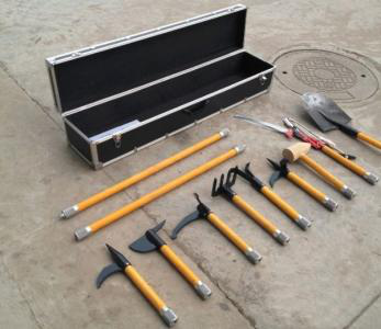 10.普通接杆、多用接杆:单杆长一米,通过组合连接,可以在现场迅速的量距离、标高、测坑或涵洞深度,便于操作人员作出科学决策和救援行动;也可以作为火灾、浓烟、洼池、水坑等场所灭火救援的探路工具,如使用两根1米长的挠杆,中间穿土布兜(可以借用衣服、裤子)或网兜,可充当临时担架